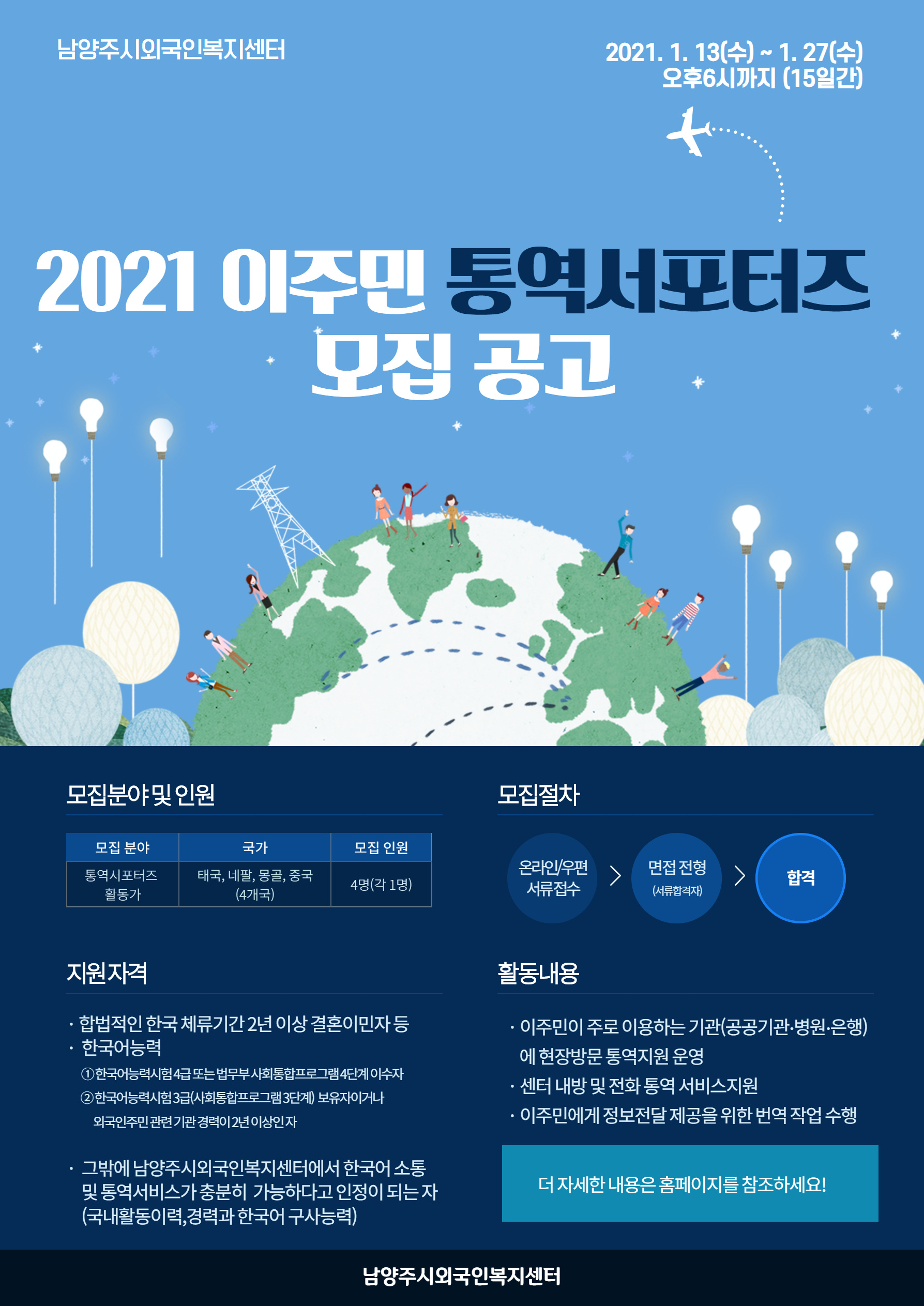 남양주시외국인복지센터에서는 의료, 체류, 임금체불 등 어려움을 겪는 이주민들을 위해 신속하고 원활한 통역서비스를 지원, 제공하기 위해 이주민 통역서포터즈를 모집하고자 합니다.