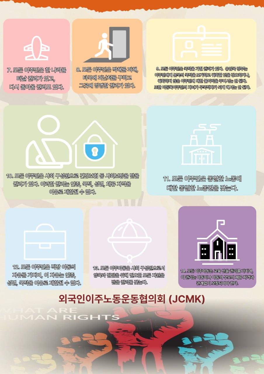 1990년 12월 18일, 유엔 총회는 이주노동자와 그 가족의 인권을 보호하기 위해 <모든 이주노동자와 그 가족의 권리 보호에 관한 국제협약> (이주민권리협약)을 채택했습니다. 이 협약은 이주민도 체류자격과 관계없이 인간으로서 존엄과 권리를 보장받아야 한다는 원칙을 담고 있습니다. 하지만 한국 정부는 아직 이 협약을 비준하지 않고 있으며 이주민에 대한 차별을 정당화하고 있습니다. 현행 이주민 지원법은 출입국관리법, 재한외국인처우기본법, 외국인근로자 고용 등에 관한 법, 다문화가족법 등이 있지만 이주민의 관리와 통제뿐만 아니라 배제를 원칙으로 하고 있습니다. 실제적으로 이주민의 인권을 보장한다고 할 수 없습니다. 이에 우리는 사람의 존엄과 평등을 침해하는 모든 정책에 반대하며, 이주민권리협약의 즉각적인 비준을 촉구합니다. 또한, 한국정부 국회와 법무부에 시민사회의 요구를 전달하여 조속히 이주민권리협약을 비준하도록 노력하겠습니다.