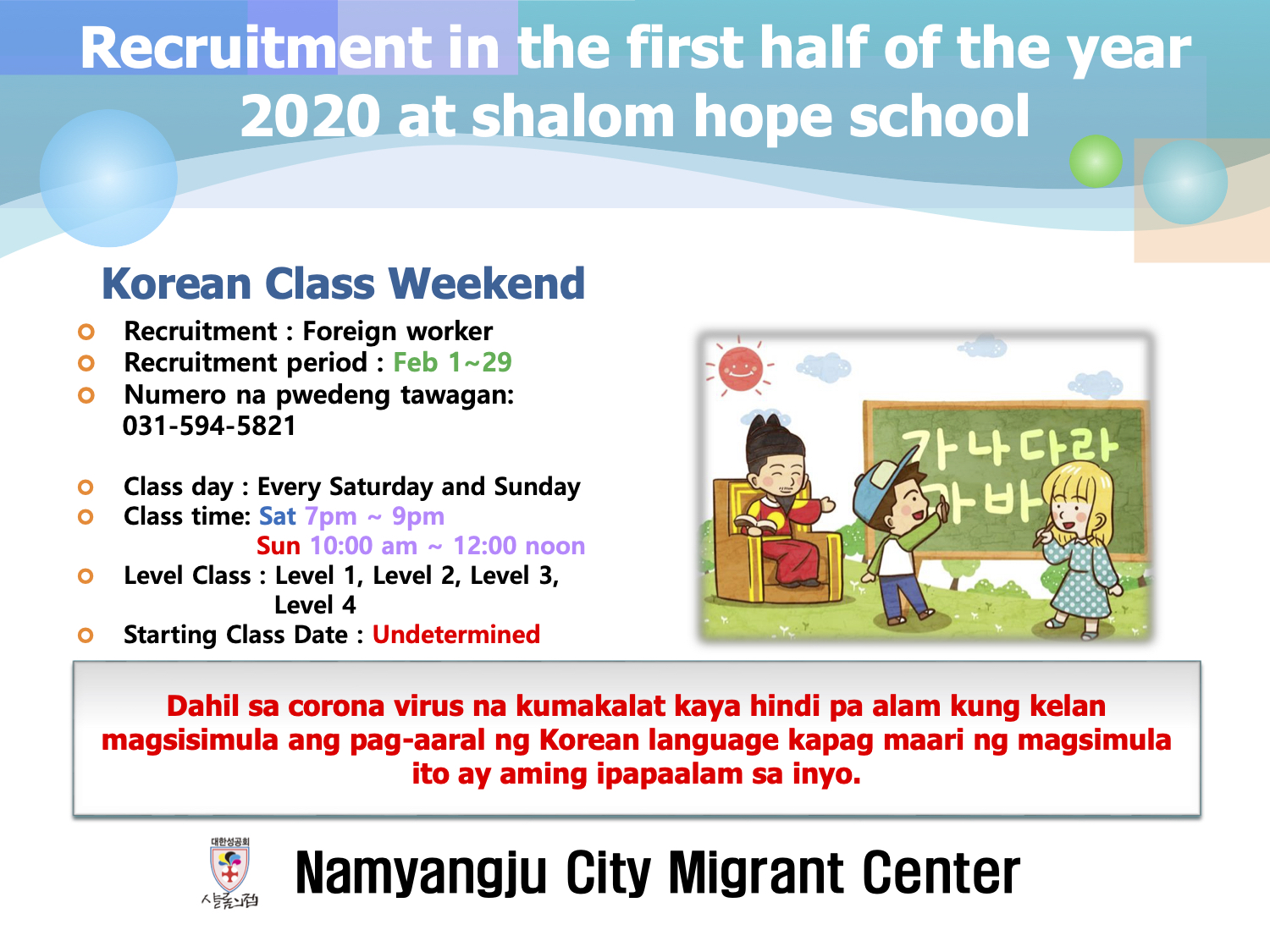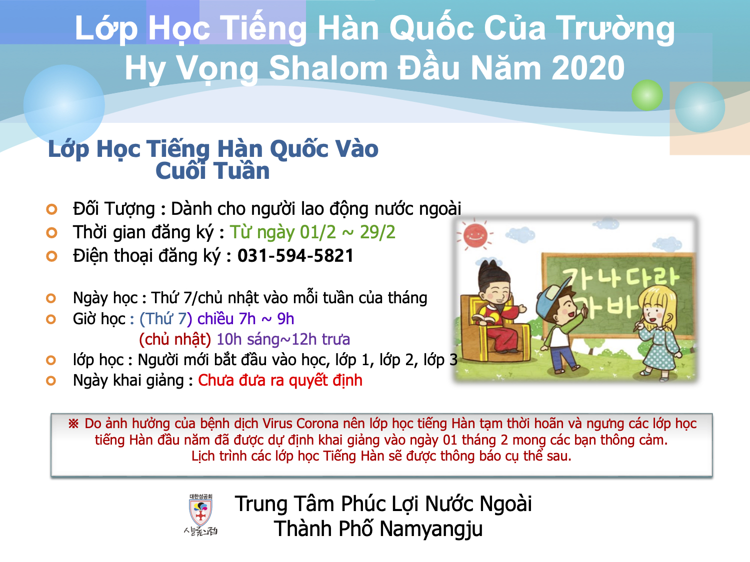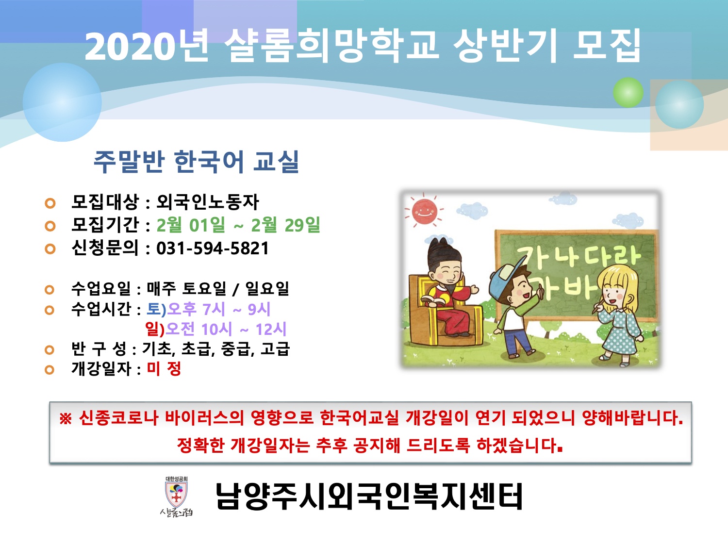 | 한국어교실 개강연기 안내_이주여성 (0) | 2020.02.12 |