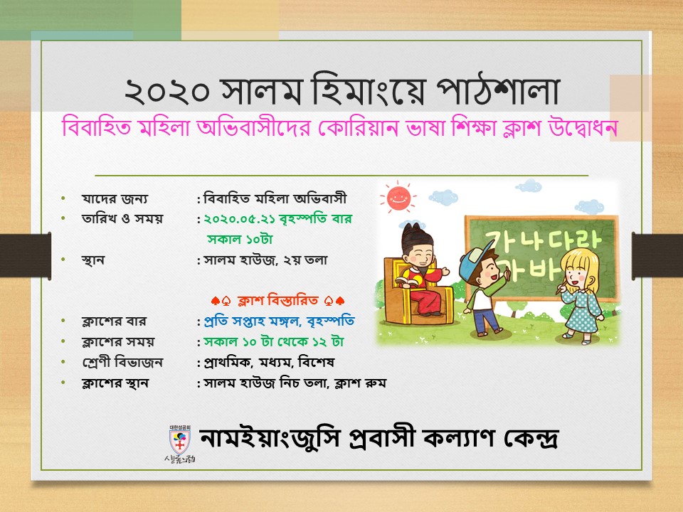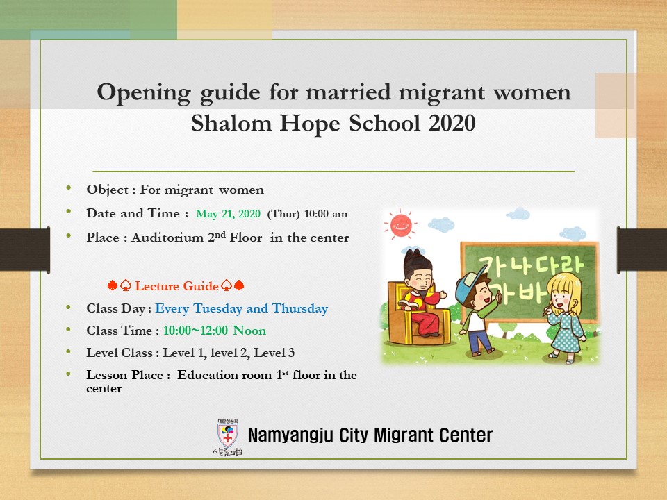 NOTICE 드디어 시작합니다. - 한국어교실 shalomhouse 2020. 5. 18. 11:53 생활방역으로의 전환 시점에 맞추어 그동안 실시하지 못하였던 한국어교실을 시작합니다.마스크와 손소독은 필수입니다! ^^ 공유하기 게시글 관리 남양주시외국인복지센터 'NOTICE' 카테고리의 다른 글 알려드립니다! (0) 2020.05.20 알려드립니다! (0) 2020.05.19 외국인 근로자(E-9) 20.5.6.부터 한국 입국 시 현지 EPS센터에서 발급한 자가격리 확인서 필요 (0) 2020.05.16 알려드립니다! (0) 2020.05.14 알려드립니다! (0) 2020.05.09 'NOTICE' Related Articles 알려드립니다! 알려드립니다! 외국인 근로자(E-9) 20.5.6.부터 한국 입국 시 현지 EPS센터에서 발급한 자가격리 확인서 필요 알려드립니다!
