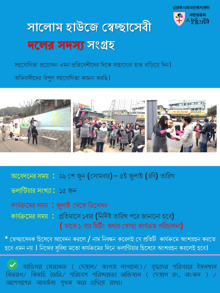 샬롬외국인자원봉사 동아리회원을 모집합니다.