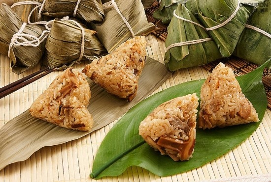 중국의 단오에 먹는 전통음식. 찹쌀과 고기, 떡 등을 사면체 모양으로 만들고