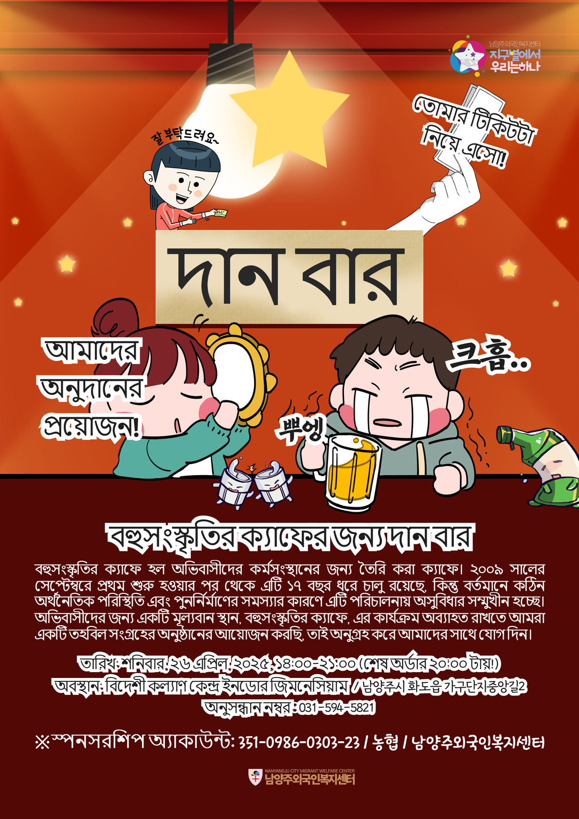 다문화카페 알이랑은 결혼이주여성의 일자리를 위해 만들어진 공익카페입니다. 2009년 9월 처음 시작으로 올해로 벌써 17년째 운영하고 있으나, 최근 어려운 경제상황과 공단재개발 문제 등으로 운영에 어려움을 겪고 있습니다. 이주민들의 소중한 커뮤니티 공간으로 자리매김한 다문화카페 알이랑이 계속 운영될 수 있도록 기금조성을 위한 후원주점을 개최하오니 함께 하여주시기 바랍니다.
